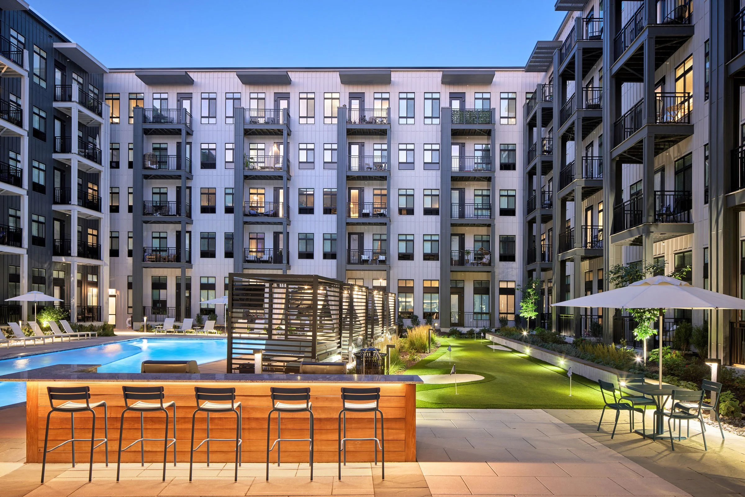 Highlights include private pool cabanas, a gaming lawn with putting turf and ping pong tables, and access to local trails and bike rentals that encourage active living. Entertainment kitchens, group fitness classes, and fireplaces bring community members together while co-working and makers lounges support individual and professional growth.